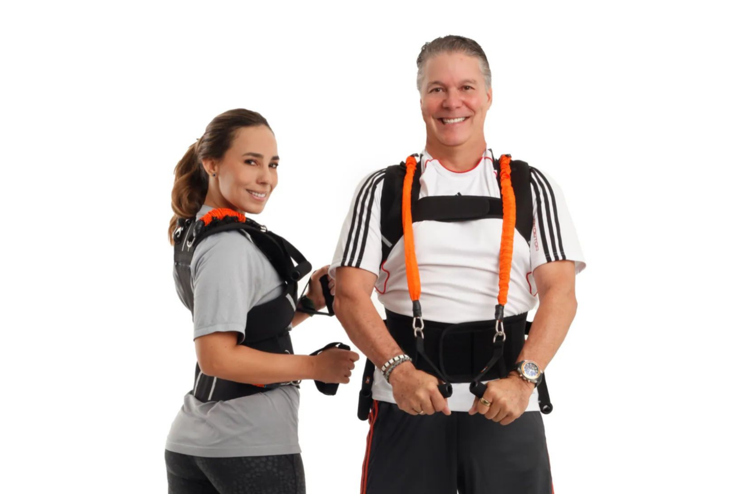 The package includes a multifunctional vest for muscle strengthening and posture correction, 4 elastic resistance bands (2 of 30 Ib + 2 of 40 Ib), a bag to carry the vest, the user manual and the exercise booklet.